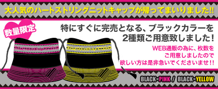 NEWS 2014-10-30【10月31日(金)正午】大人気ハートストリングニットキャップ予約受付開始! ■注文受付2014年10月31日(金)正午~■発送予定2014年12月上旬■ハートストリングニットキャップ¥7,344(tax in)カラー:ブラック×ピンク♪商品ページはこちらからカラー:ブラック×イエロー♪商品ページはこちらから PREV 一覧へ NEXT